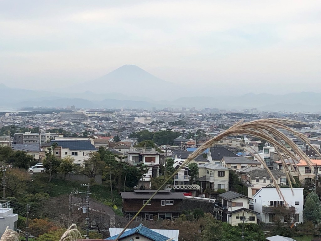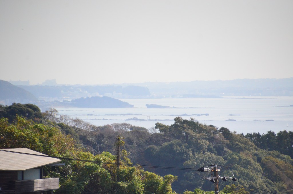 2023年11月9日(木)08:00 今日は腫れていますが薄雲て富士山がかすんで見えます(左写真;片瀬山より)。このところの異常気象で、山頂に積もった雪が溶けてしまいました。海も全体的に白っぽく見えます(右写真;鎌倉山より。